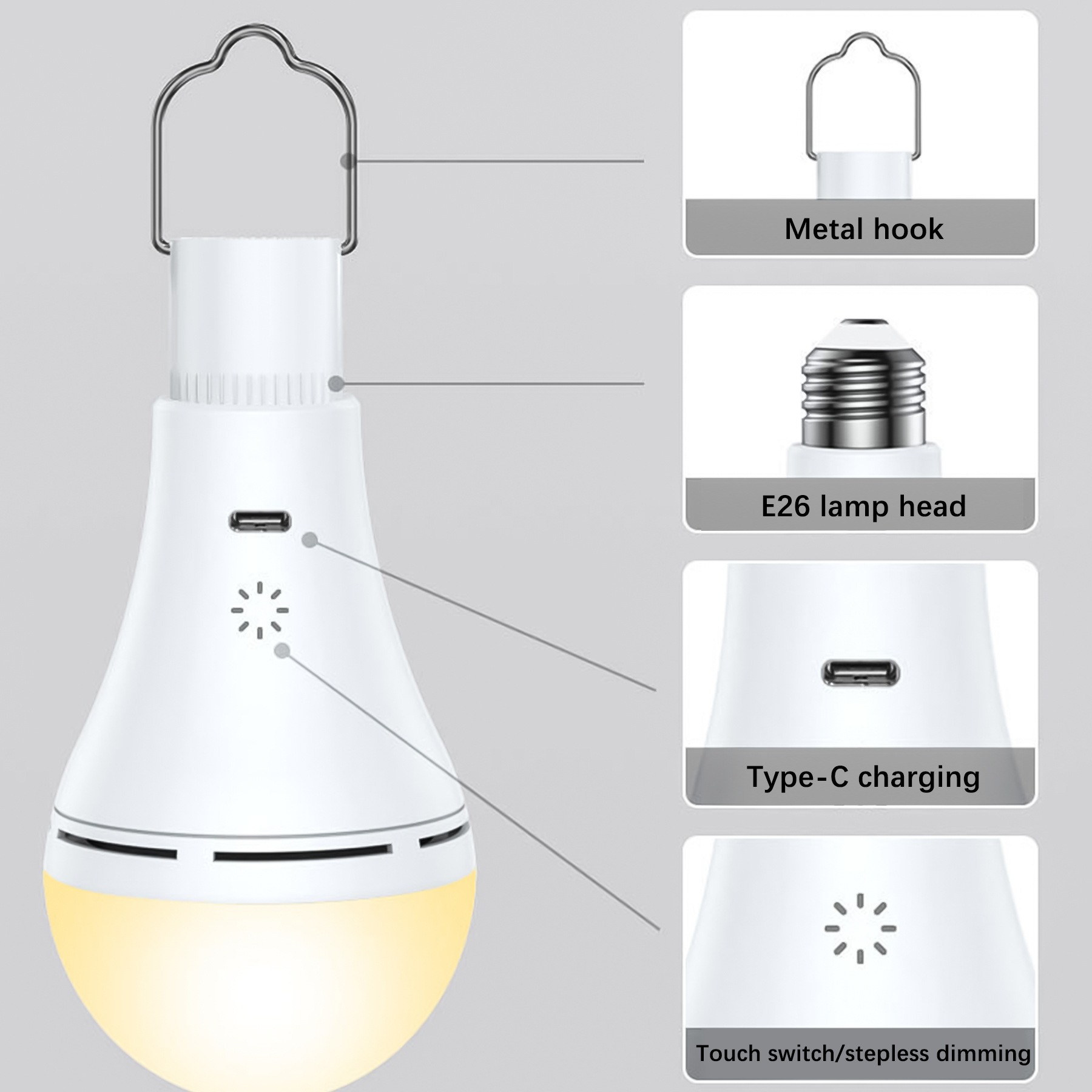【Multiple Application Scenarios】The rechargeable light bulb has a detachable hook design, which is more convenient to use and carry. It can be used with wall lamps, table lamps, floor lamps, chandeliers, ceiling lamps, etc., and is widely used in indoor, outdoor, camping, farmhouses, garages, barns, camping, travel and other places.