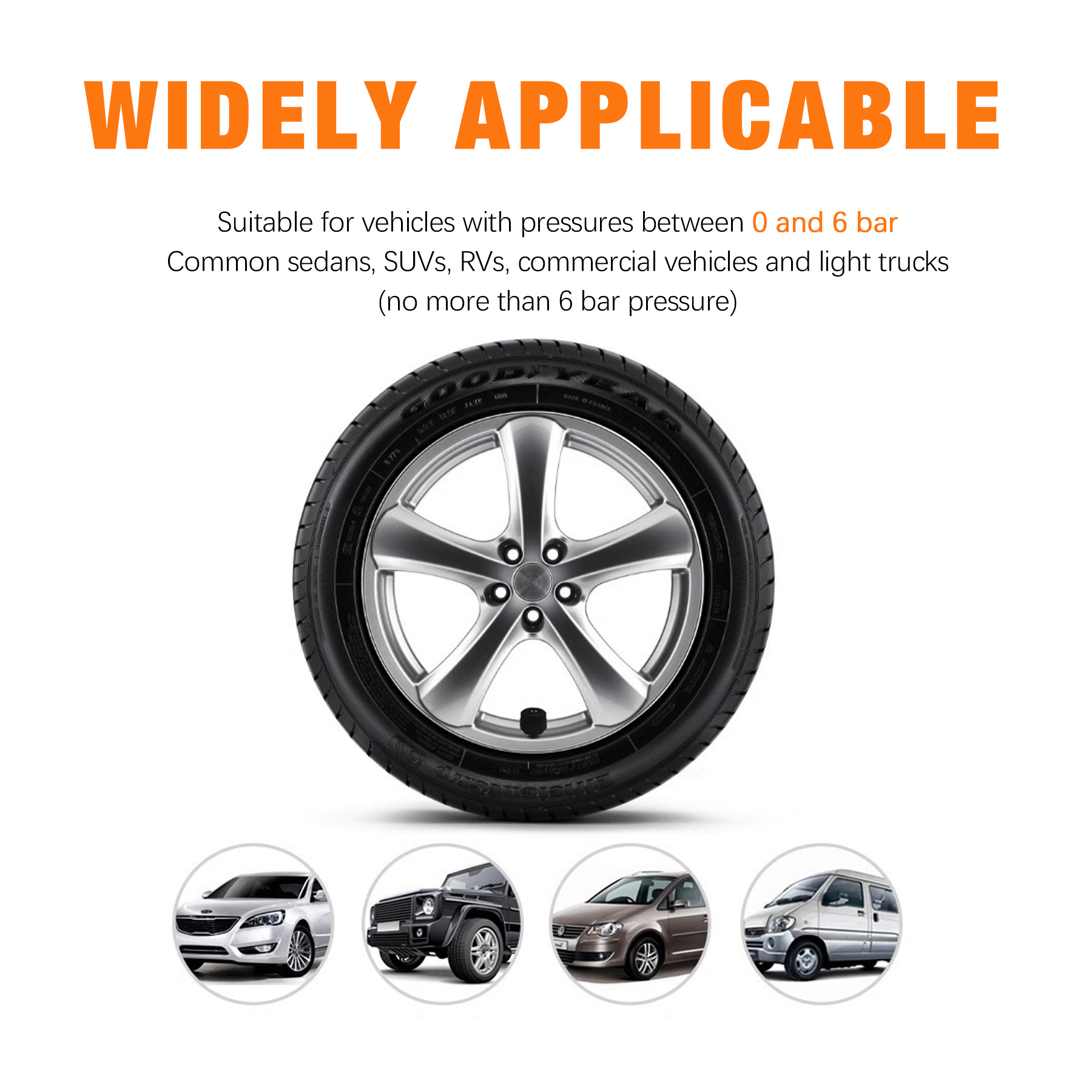 【Wide Application】This tyre pressure sensor is suitable for models with tire pressure range of 0~6 Bar, such as cars, SUVs, MPVs, sedans, station wagons, RVs, etc.