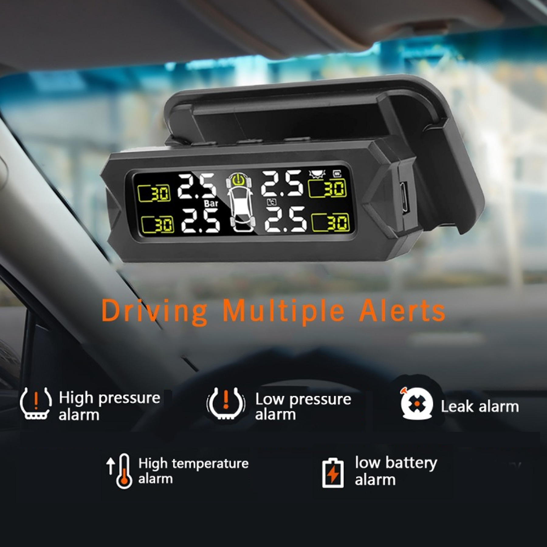 【Real-time detection】This tire monitor sensor has accurate alarm prompts, fast air leakage alarm, slow air leakage alarm, high pressure alarm and high temperature alarm, sensor fault alarm and sensor low battery alarm. Using wireless transmission technology, the data is refreshed every second during driving. The TPMS tire pressure monitoring system can remind you of the tire condition of your vehicle, extend the tire life and ensure the safety of the driver.