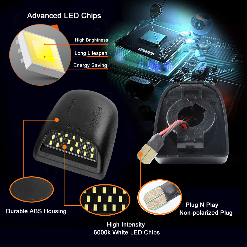 - Super Bright LED Chips: Doxmall Cadillac license plate lights are built with 18Pcs 100% advanced high brightness LED chips with intensity lighting output and low power consumption, which was 10x brighter than factory light bulbs, showing you a larger effective irradiation area and perfect light pattern, dramatically improving the lighting on rear license plate visibility at night. Directly upgrade replacement part to replace the old or defective OEM license plate lights