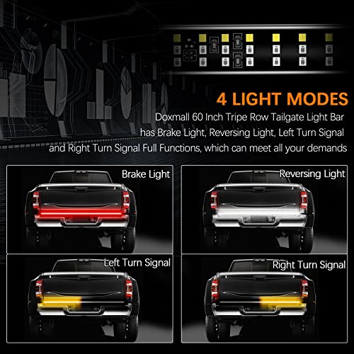 - MULTIFUNCTIONAL – Features full functions of brake, sequential turn signal, running, reverse and strobe light. The Triple-row tailgate light emits Low Red for running, Bright Red for braking, Amber for left/right turning signals, White for reversing, and Flash Amber for emergency strobe light Let everyone behind you clearly knows what you will do next and avoid traffic accident. The sequential amber turn signals is definitely eye catching and enhace you car look.