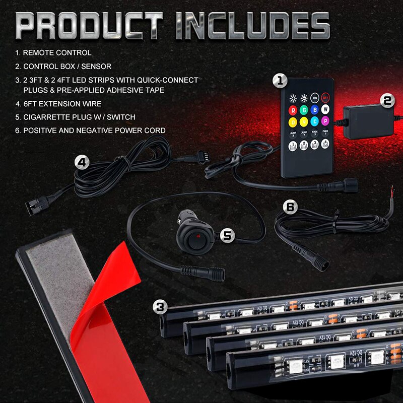 - Waterproof Strip Lights: The strip lights are waterproof. Designed with flexible tubing, Protected from terrible Road Conditions and Debris. High quality material and Low Temperature Resistance.