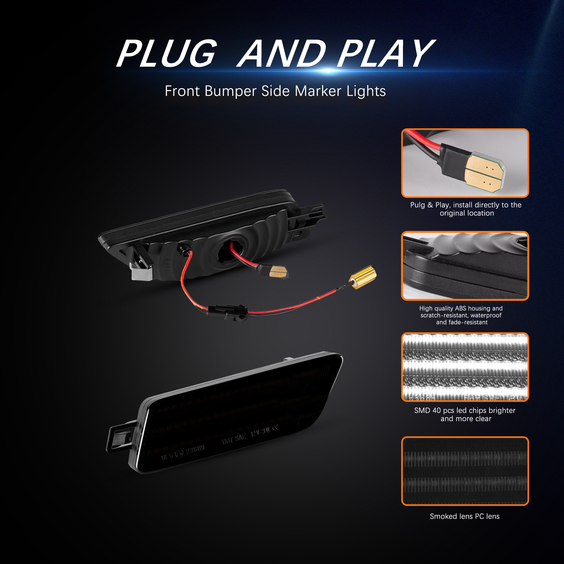 Installation: Easy installation, plug & play, no wiring or modification required, no damage to original housing. It only takes about 10 minutes to perfectly replace the original OEM side marker lights.