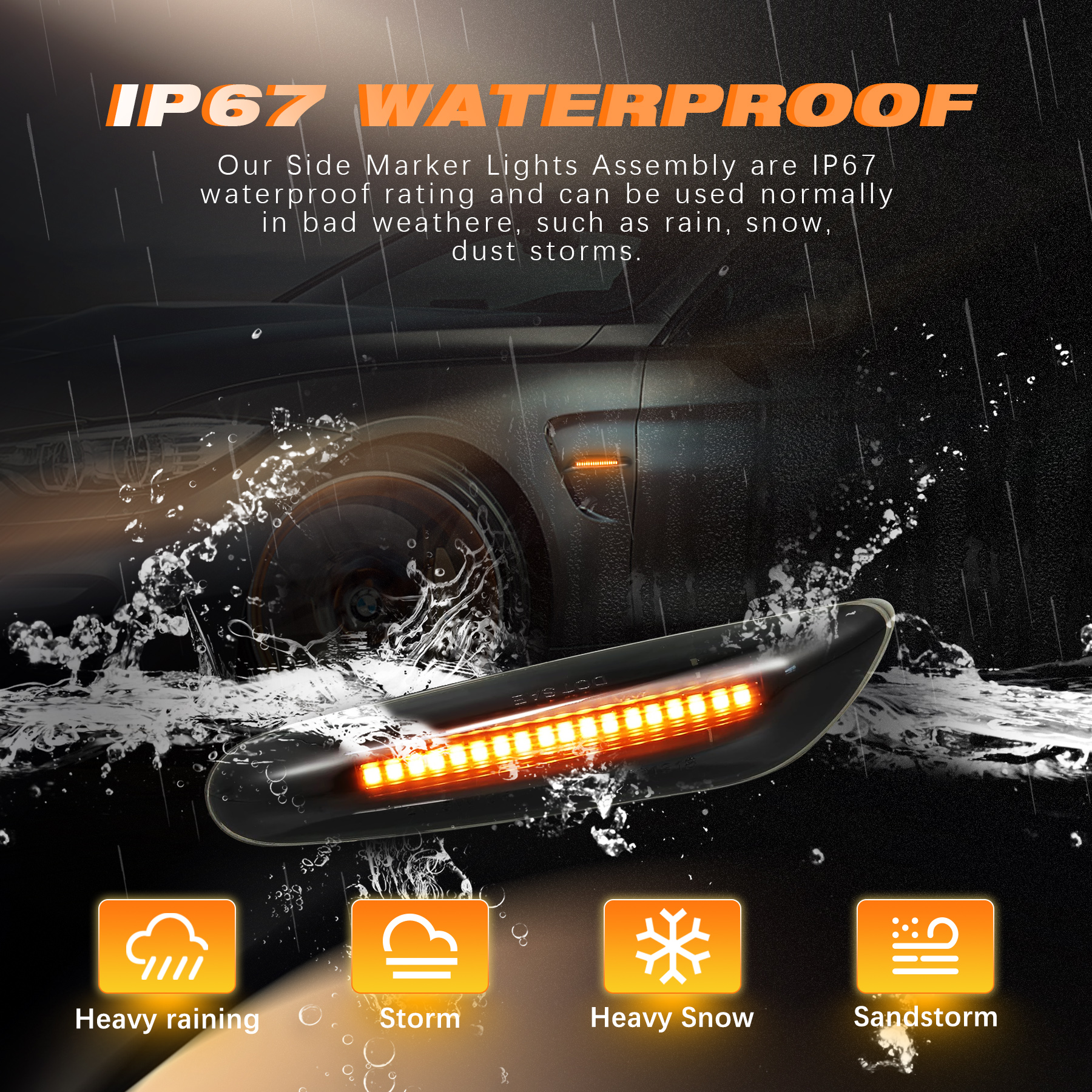 Waterproof Rating: The front flowing LED light has IP67 waterproof rating, excellent sealing, and can be driven safely on the road in any weather, such as rain, snow, sandstorm and other bad weather.