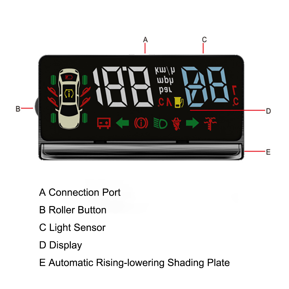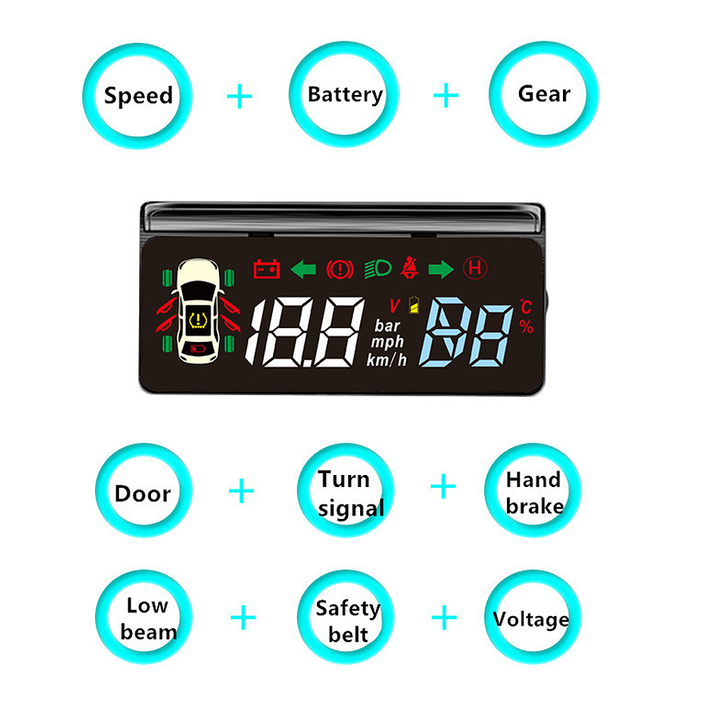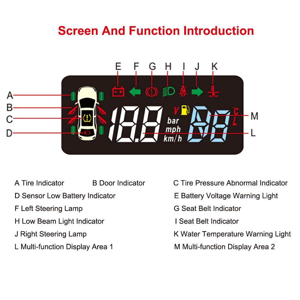 1. A variety of indicators alarm function: over speed alarm, low voltage alarm, high water temperature alarm, no seat belt alarm, handbrake alarm, headlights alarm, door open alarm, tire pressure alarm.