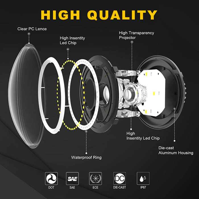 - LIGHTS QUALITY – The best 7 inch motorcycle LED headlight with LED Halo ring angle eye. This LED headlight is highly durable; the lens is made from high quality polycarbonate plastic, and the body is heat treated die-cast aluminum. Powered by high output LEDs, this headlight offers the best and the brightest 7″ LED headlight.