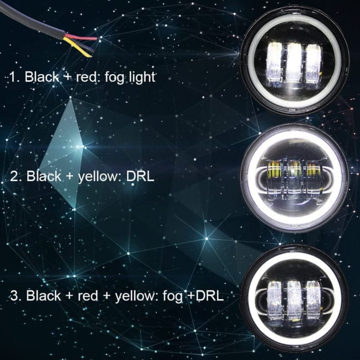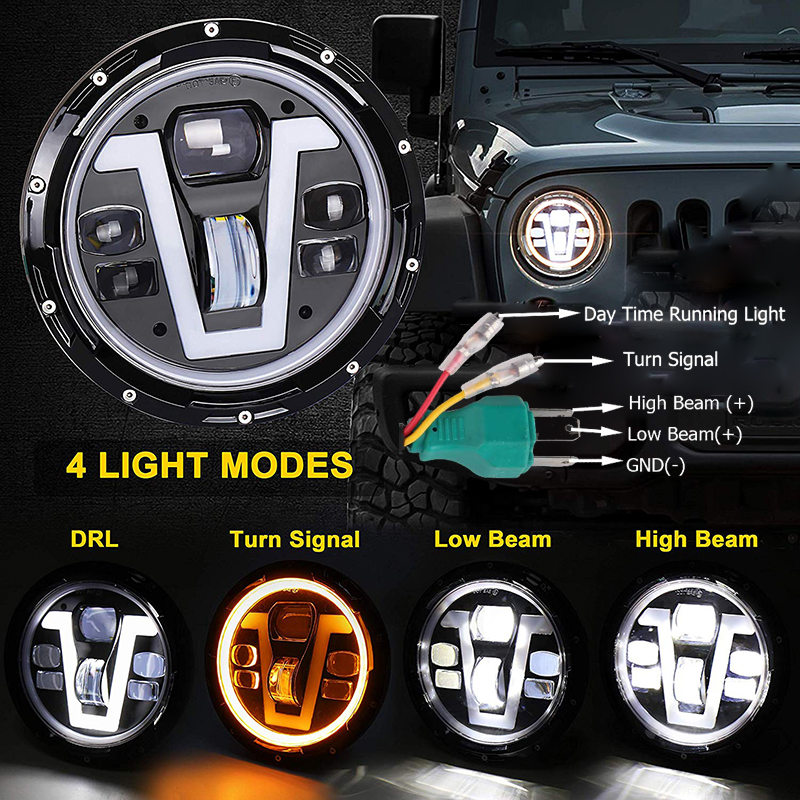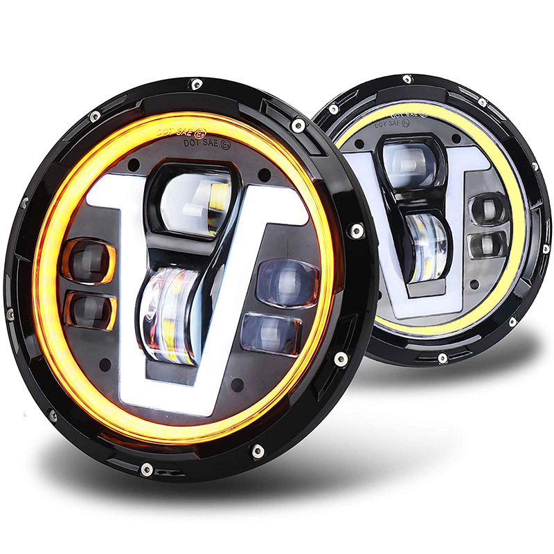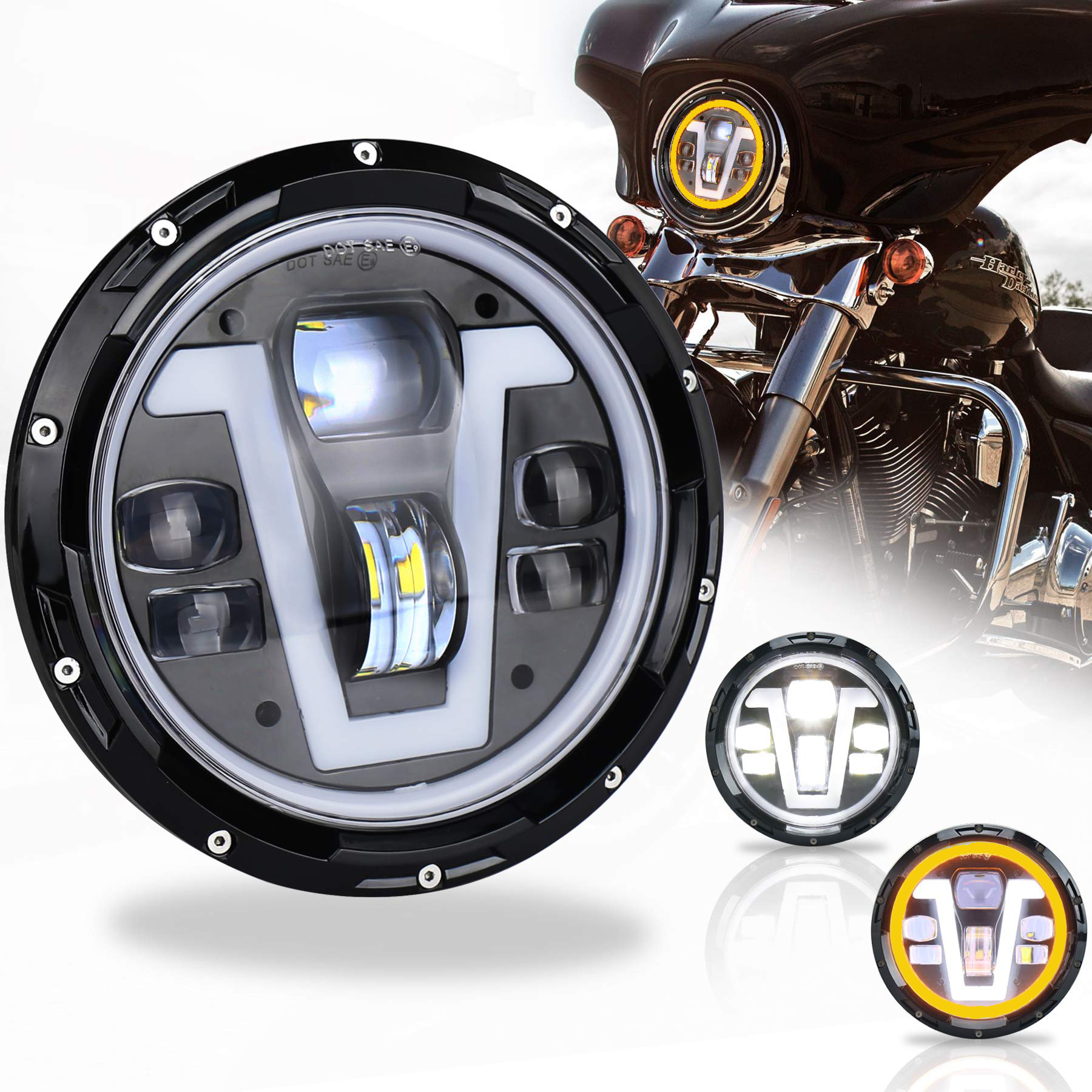 - DRL & Turn Signal: As shown, we added the design of V type and fish-eye lens on the basis of the halo ring led headlights. Includes high/ low beams , turning signal light (amber halo angel eyes) and daytime running light (white color V type). Driving with this motorcycle headlight will make your motor with noteworthy conduct and independent character. Discernible DRL & Turn Signal will improve your night Driving, even Rainy, Foggy.