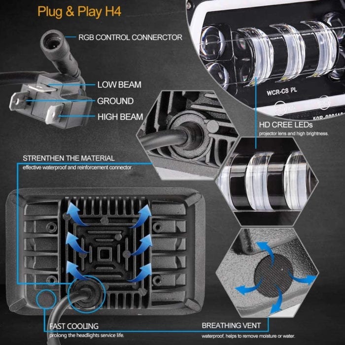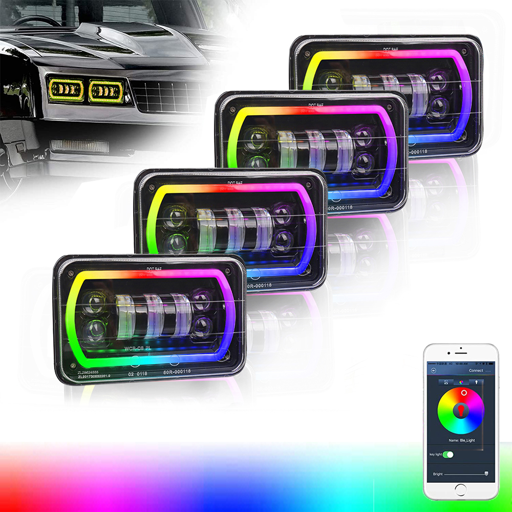 - Super bright 4×6 inch led headlights with RGB halo: 4500lm@High beam, 3000lm@ Low beam, give you broad view to make you far away from hidden danger in the dark; Helps to reduce traffic accidents cause by bad weather or adverse road condition.Search the ‘OL-blelight’ in the App store to download this APP and connect the device via bluetooth.