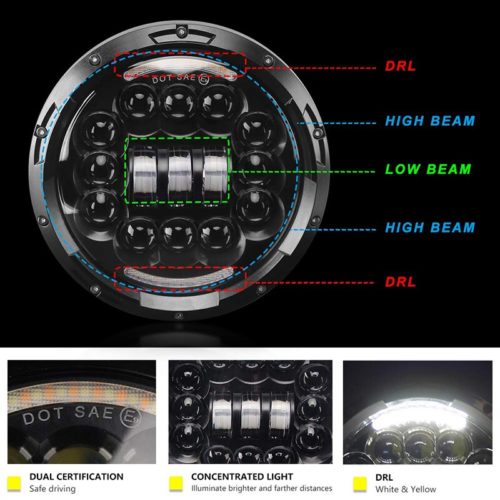 - 【HIGH-PERFORMANCE CREE LED CHIP】 ﹣ DOT Approved. Newest Fantastic Design 7″ LED Headlights with Daytime Running Light are more Brighter than Original Halogen and HID. 7200LM / Kit; Over 50,000 Hours Lifespan.