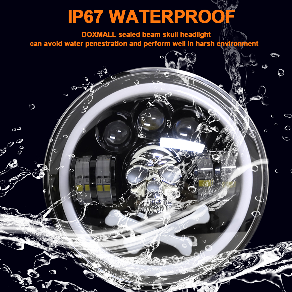 - 5 Lighting Modes: Doxmall Skull headlight comes with High Beam, Low Beam, Amber Turn Signal, White DRL and RGB Skull+Bone Pattern. It is also available for RGB skull working with Amber halo or White halo at the same time. You can do it just by connecting two wires meanwhile.