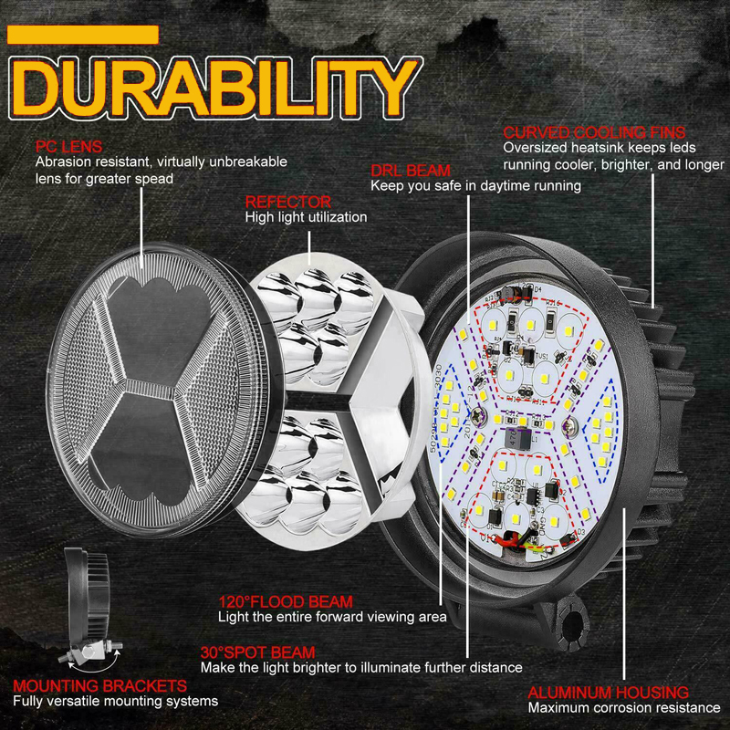 - Effective Oversized Heat System – This round led pod lights with 15PCS Die-cast thick housing design, effective reducing wind resistance, faster heat disspation, make it more durable and longer service-life.